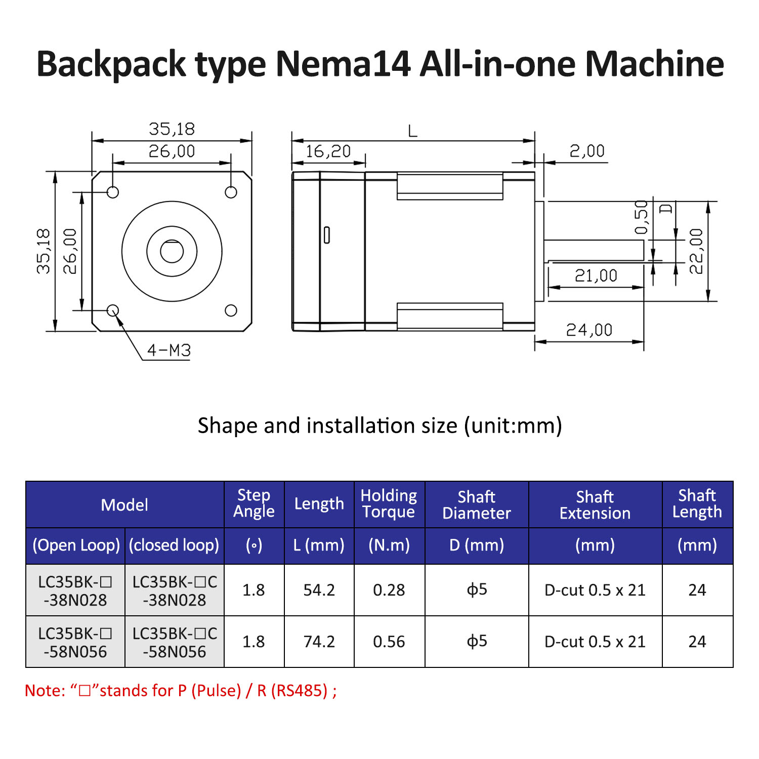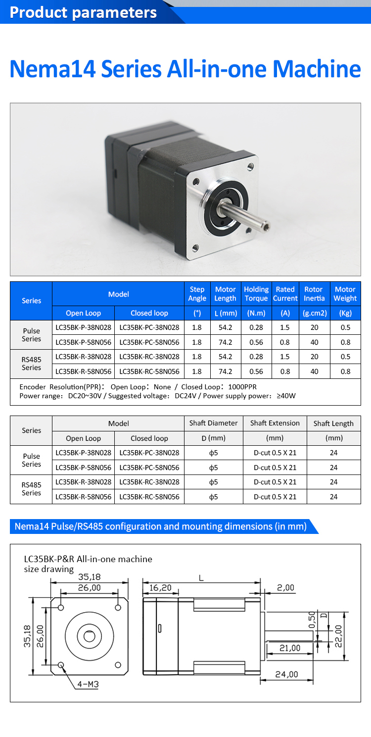 EtherCAT 2Phase Nema24 4-Axis DC Closed Loop Stepper Drivers MotorsΤύπος σακιδίου NEMA14 Ανοιχτός βρόχος-κλειστό βρόχο ενσωματωμένο βηματικό κινητήρα. Που έχει έλεγχο παλμού/RS485. Πρόγραμμα επεξεργασίας συναγερμού παλμού/rs485 all-in-one. Σταθερή λειτουργία με άνοδο Lownoise και θερμοκρασίας, χωρίς να υποστηρίζει απώλεια βημάτων. Το σύστημα εξοικονόμησης χώρου all-in-one απλοποιεί την εγκατάσταση. Γωνία βήματος: 1.8 γωνία βημάτων. Κρατώντας ροπή 0.28/0.56n.m. Ανάλυση κωδικοποιητή (PPR): Ανοίξτε βρόχο: Κανένας / κλειστός βρόχος: 1000ppr. Εύρος ισχύος: DC20 ~ 30V/προτεινόμενη τάση: DC24V/τροφοδοσία τροφοδοσίας: ≥40W. Είμαστε αρχικό εργοστάσιο, έχουμε πιστοποιητικό CE, ROHS.